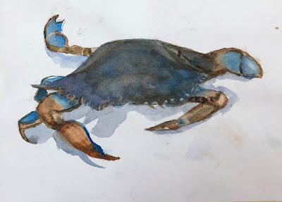 In my Wednesday Studio class, teacher Ellen Cornett challenged us to paint a crab. This is my version. I am still struggling with painting from photos, but I did enjoy doing it and trying to meet the challenge of the colors. I doubt I would have seen this crab in person anyway and have it stay in position long enough to paint it!